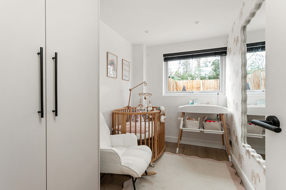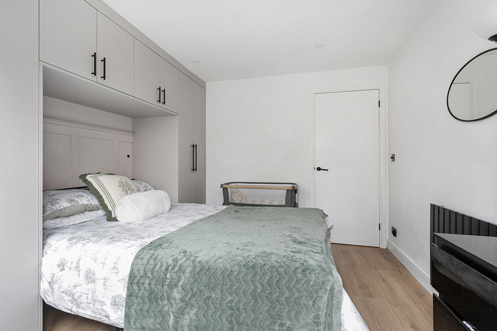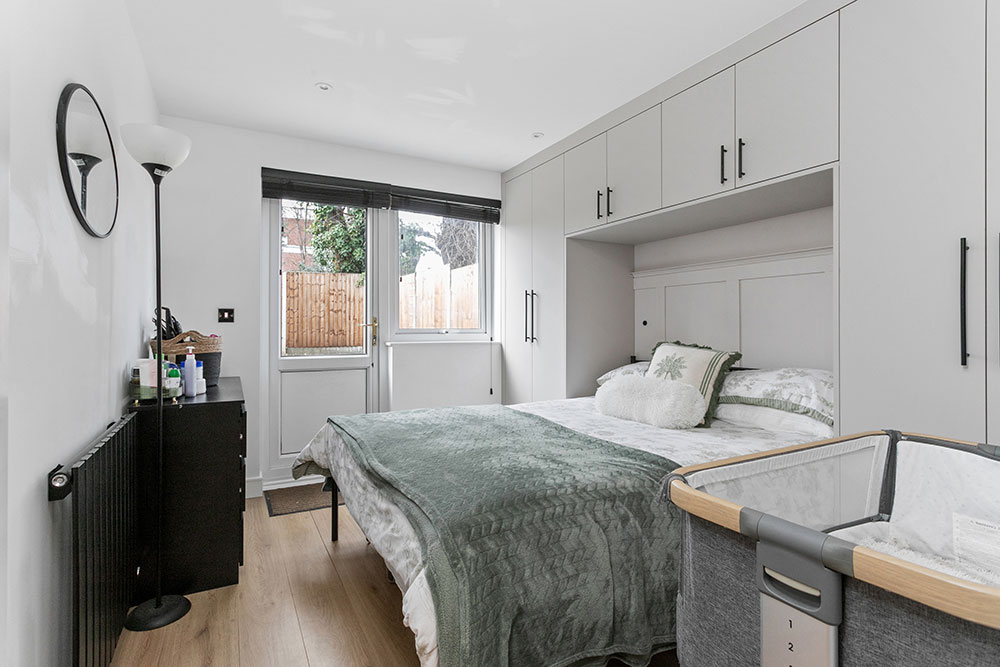 The second bedroom offers a flexible space, ideal as a guest room, nursery, or home office. Overlooking the garden and complemented by a convenient storage cupboard, this room adapts perfectly to your lifestyle needs.