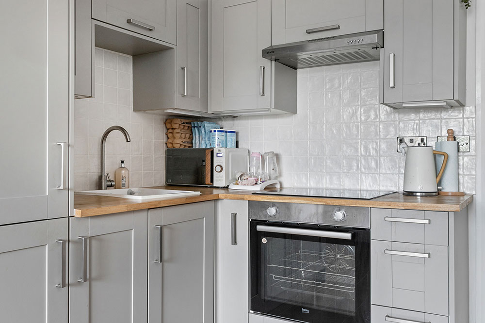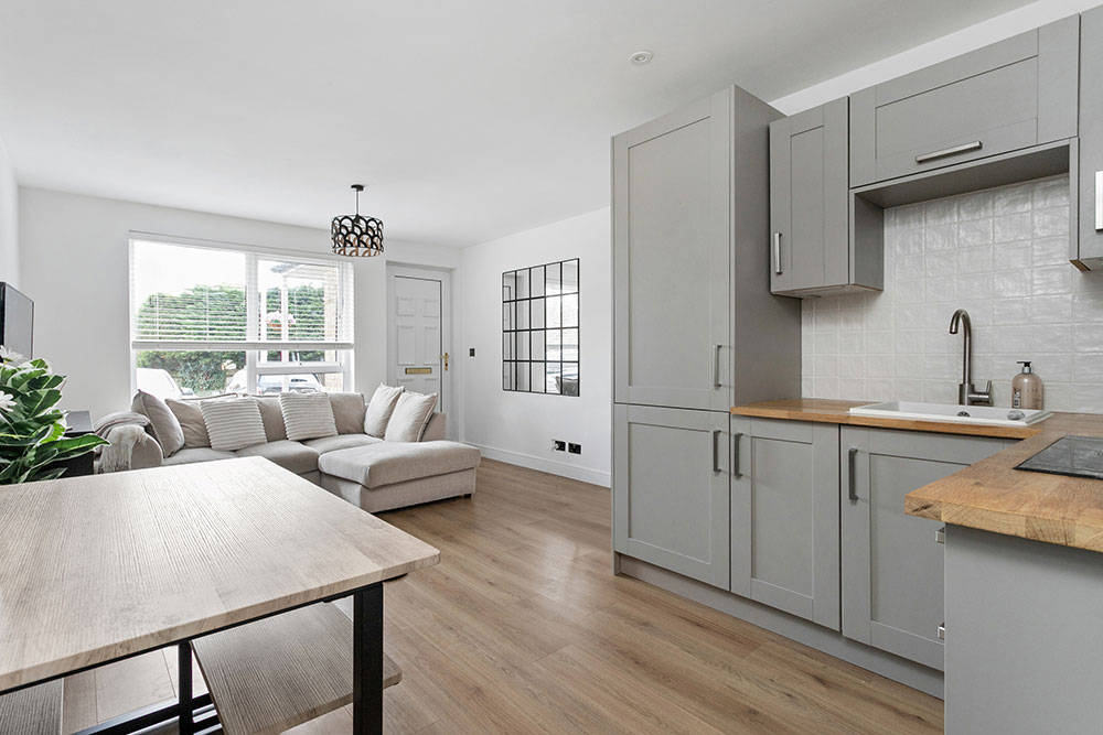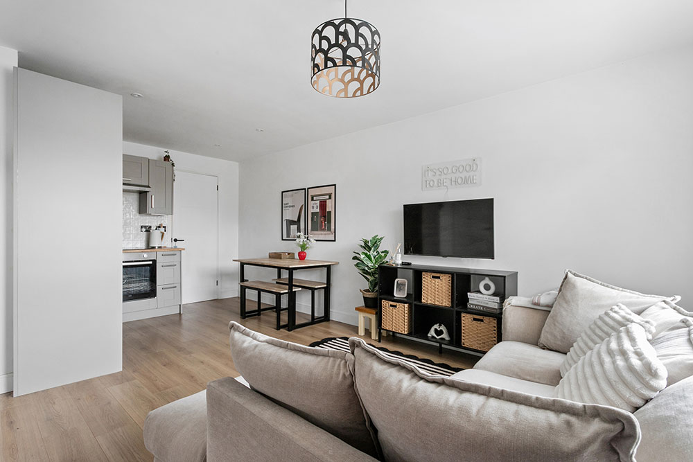 The bright, open-plan living, dining, and kitchen area is designed for modern living. Whether it’s a cosy night in on the sofa, dinner parties with friends, or experimenting with your signature recipes, this space adapts beautifully to every occasion. The kitchen features sleek fitted wall and base units, a work surface with tiled surround, and integrated appliances including an oven, hob, and fridge/freezer. A handy utility area just off the living space keeps everything organized and out of sight.